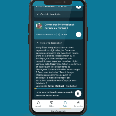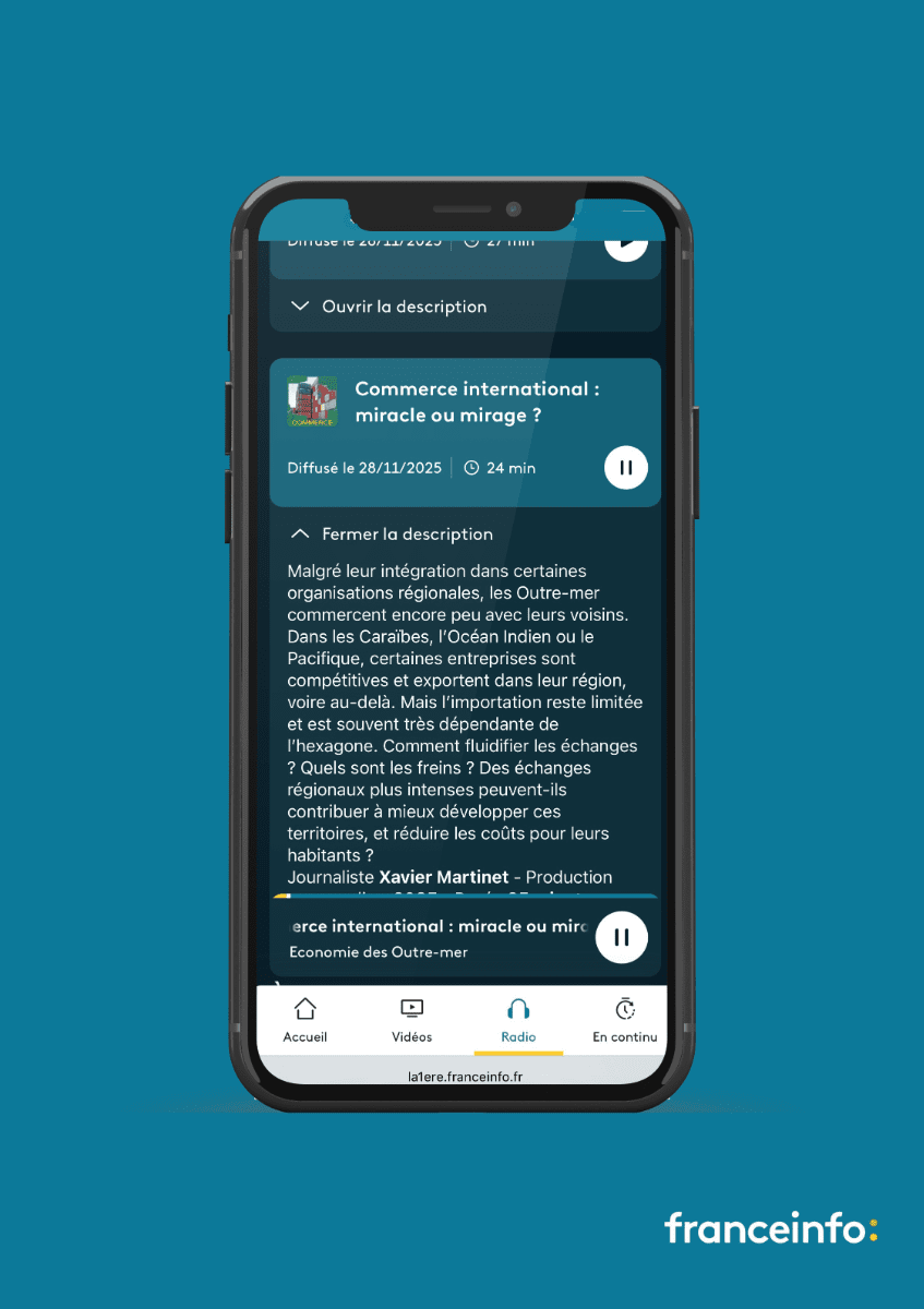 La série de podcast "Économie des Outre-mer" a été créée par France Info La 1ère sur l’économie des Outre-mer et son potentiel parfois sous-estimé. France Info la 1ère donne la parole aux acteurs des territoires ultramarins pour démontrer les ressources, les dynamiques et des stratégies de ces territoires et de ses habitants.