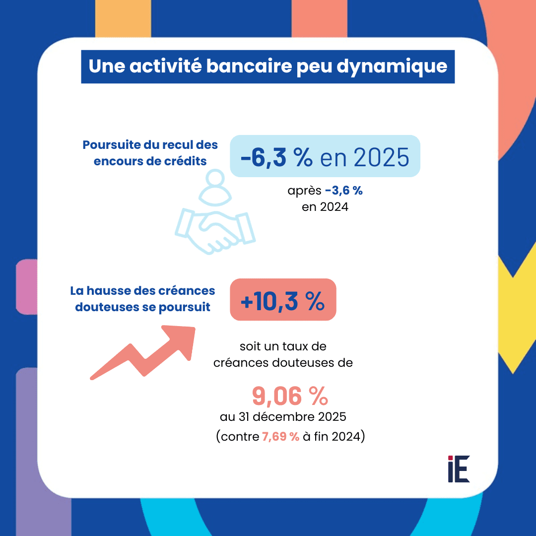 En 2025, la consommation des ménages n’a pas retrouvé son niveau de 2023 : les paiements et retraits par carte bancaire ont progressé de 3,5 % en 2025, après un repli de 6,9 % en 2024. L’activité bancaire est également profondément affectée puisque la production totale de crédits (hors découverts) a baissé de 3,2 % par rapport à 2024 et de 50,5 % par rapport à 2023, alors même que les taux ont été globalement orientés à la baisse.