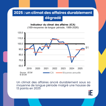 En 2025, l’indicateur du climat des affaires (ICA), mesuré par l’IEOM, poursuit son redressement depuis le plus bas enregistré au second trimestre 2024 au moment des émeutes. L’ICA se stabilise à 91 en fin d’année, mais il demeure toujours nettement inférieur aux niveaux observés entre 2021 et 2023.
