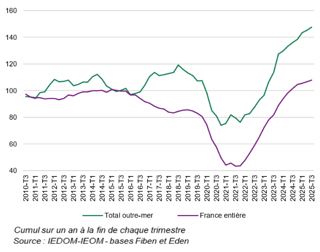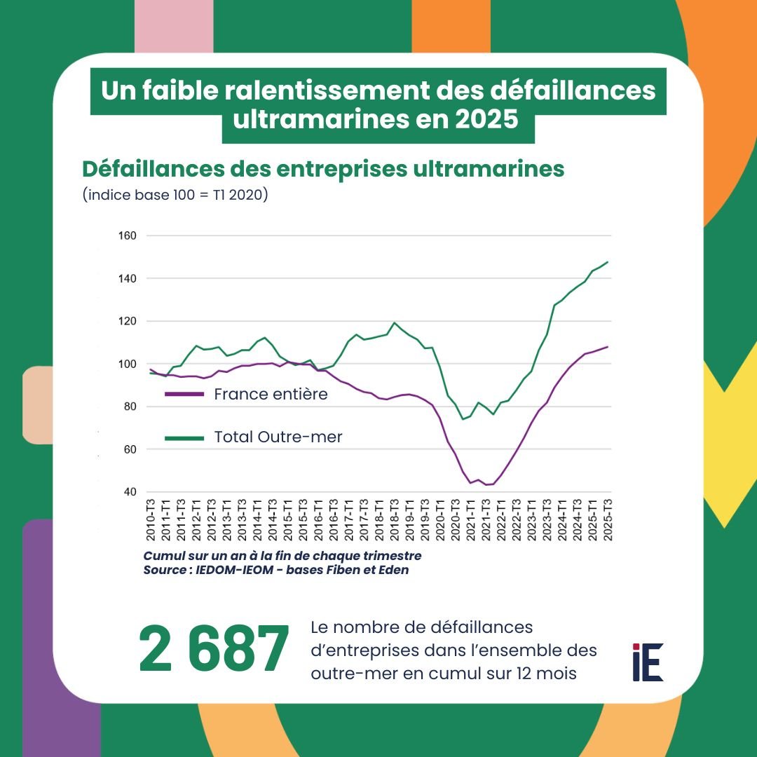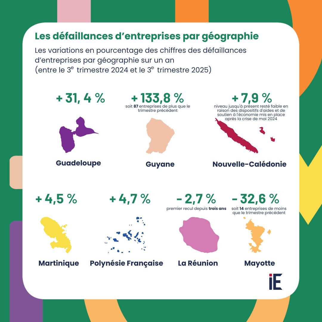 Par géographie, le nombre de défaillances augmente sensiblement en Guadeloupe (+31,4 % sur un an) et atteint un nouveau point haut avec 444 défaillances. En Guyane, il est également orienté à la hausse (+133,8 %) avec 152 jugements. Le nombre de redressements et de liquidations judiciaires en Nouvelle-Calédonie augmente de 7,9 % sur un an après trois trimestres de recul. Avec 397 jugements prononcés sur un an, il retrouve le niveau atteint au début de l’année 2024. Le niveau des défaillances était en effet resté faible en raison des dispositifs d’aides, et de soutien à l’économie mis en place pour répondre à la crise de mai 2024. En Martinique, la croissance des défaillances ralentit (+4,5 %, après +12,5 %), quand en Polynésie française, le nombre de procédures (156) est de nouveau en augmentation (+4,7 % après -10,2 %). À l’inverse, les défaillances reculent pour la première fois depuis trois ans à La Réunion (-2,7 % avec 1 046 procédures). C’est également le cas à Mayotte (-32,6 %) avec peu de défaillances en nombre (29).