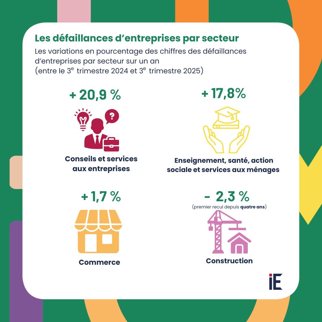Par secteur, la hausse du nombre de défaillances est portée par les conseils et services aux entreprises (+20,9 % sur un an) et l’enseignement, la santé, l’action sociale et les services aux ménages (+17,8 %). À l’inverse, le nombre de défaillances dans la construction recule pour la première fois depuis quatre ans (-2,3 %), alors que le secteur comptabilise un quart des défaillances globales.