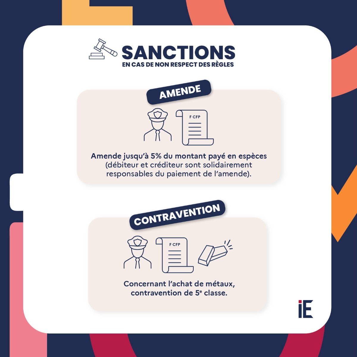 En cas de non-respect de ces règles (à l’exception des achats de métaux), la loi prévoit une amende pouvant aller jusqu’à 5% du montant payé en espèces réglé par le débiteur et le créditeur.