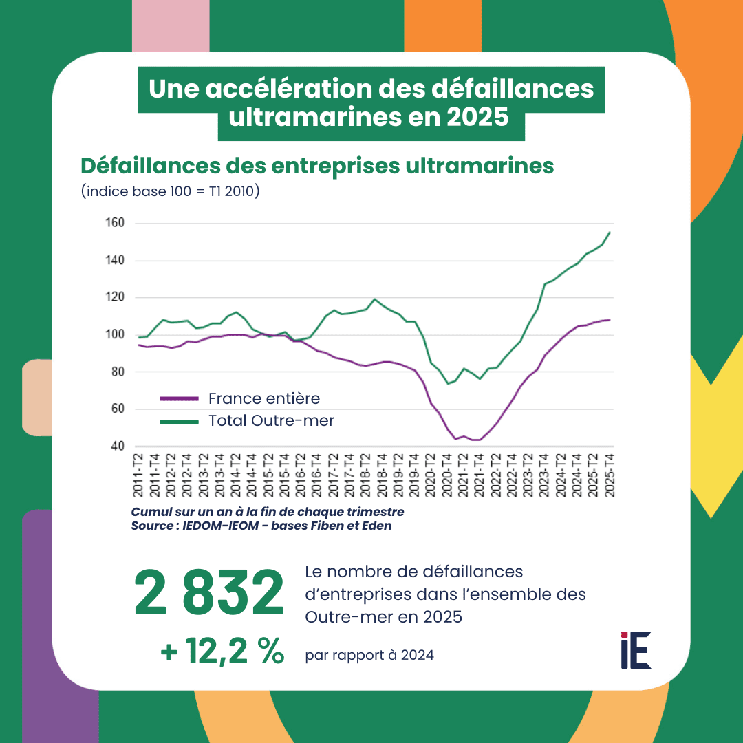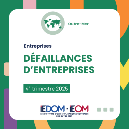 L’augmentation du nombre de défaillances accélère sensiblement en 2025 en Guadeloupe (+44,4 % sur un an) approchant les 500 défaillances sur l’année et en Guyane où le nombre de jugements a triplé en un an, conséquence des échéances de remboursement des aides accordées lors de la crise sanitaire. En Nouvelle-Calédonie, le nombre de défaillances progresse (+11,3 %) mais à un rythme contenu grâce aux dispositifs d’aides mis en place pour répondre à la crise de mai 2024. Les défaillances augmentent en 2025 (+15,6 %) en Martinique, après une baisse en 2024, et dépassent le nombre de 500 pour la première fois depuis 2013. À l’inverse, les défaillances sont en recul à La Réunion (-1,2 %) et la baisse tendancielle du nombre de défaillances en Polynésie française observée depuis trois ans se poursuit en 2025 (-18,6 %). Les défaillances à Mayotte sont en forte contraction en 2025 et concernent 20 entreprises (-52,4 %).