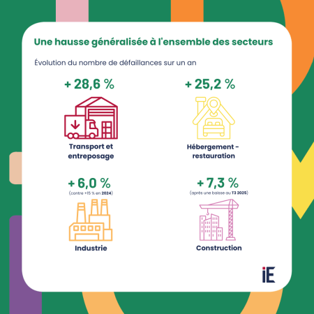 Les hausses les plus marquées concernent les secteurs du transport‑entreposage, de l’hébergement‑restauration et des services aux entreprises, tous au‑delà de +24 %. Les défaillances dans l’industrie et le commerce‑réparation automobile affichent des progressions moins marquées (respectivement +6,0 % et +3,4 %) et moins fortes qu’en 2024. Le secteur de la construction, qui concentre près du quart des défaillances, enregistre une hausse du nombre de défaillances de 7,3 % en 2025.