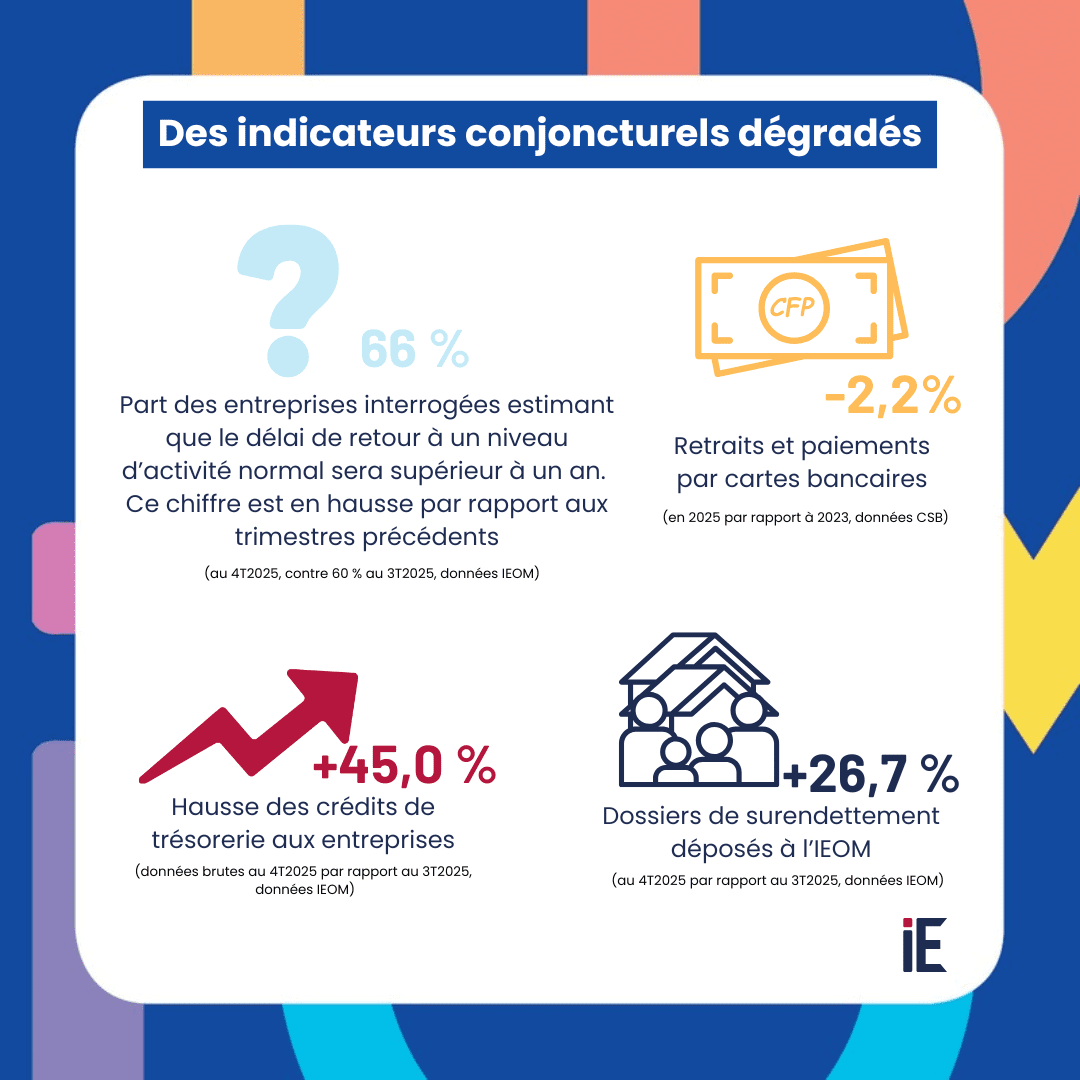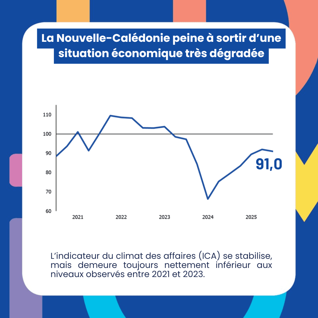 Les répercussions des émeutes de mai 2024 demeurent perceptibles et continuent d’affecter une large part du tissu économique calédonien. Si certains indicateurs s’améliorent (extraction minière notamment), d’autres restent durablement dégradés et traduisent un manque de perspectives : la consommation des ménages n’a pas retrouvé son niveau de 2023, les défaillances d’entreprises sont en hausse en 2025, et de nombreux secteurs se trouvent en grande difficulté.